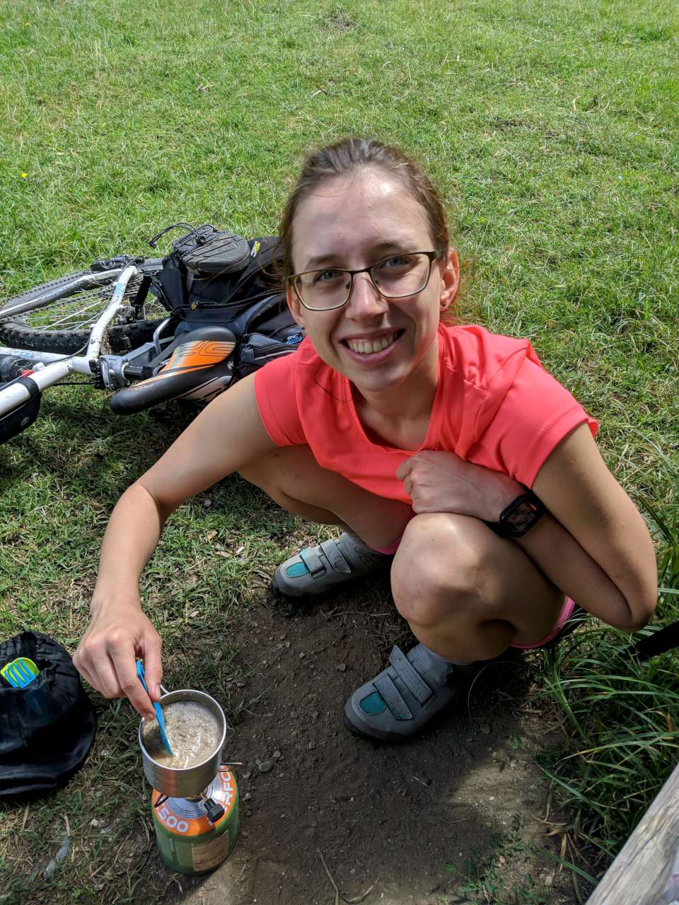 Nasleduje ešte zopár stúpaní, v ktorých mi našťastie s tlačením pomáha Patrik. Prichádzame na Čermákovu lúku, ľudia tu stanujú, opekajú a piknikujú, no my si len rýchlo dopĺňame vodu zo studničky a pokračujeme ďalej.
