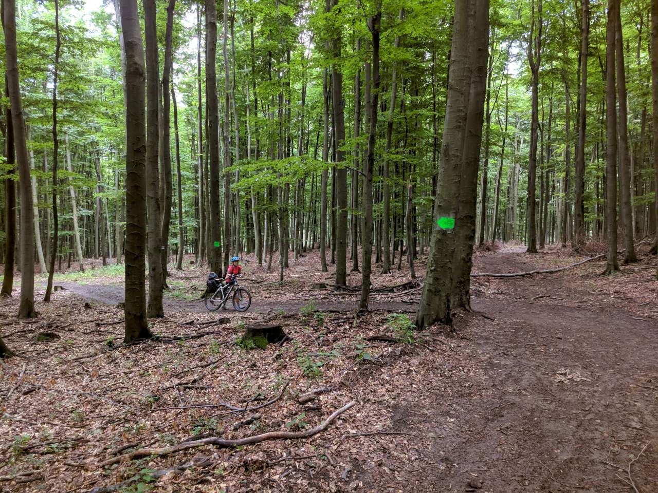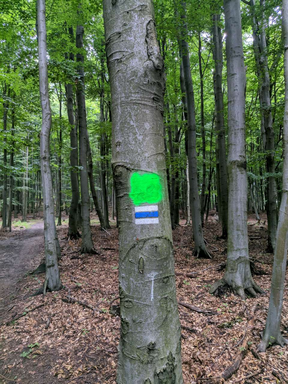 Po Hubalovú to ide samé, oddychujeme a mierne meníme trasu. Na rázcestí je totiž značka, kde sa dozvedáme, že na Sedlo skalka by okrem turistickej značky, mala viesť aj cyklotrasa. Pár minút nasledujeme na stromoch namaľované “céčka”, ktoré ale v zápätí akoby sa pod zem prepadli. Po bližšej inšpekcii zisťujeme, že ich niekto zatrel neónovo zelenou farbou, ktorú sa rozhodneme nasledovať.