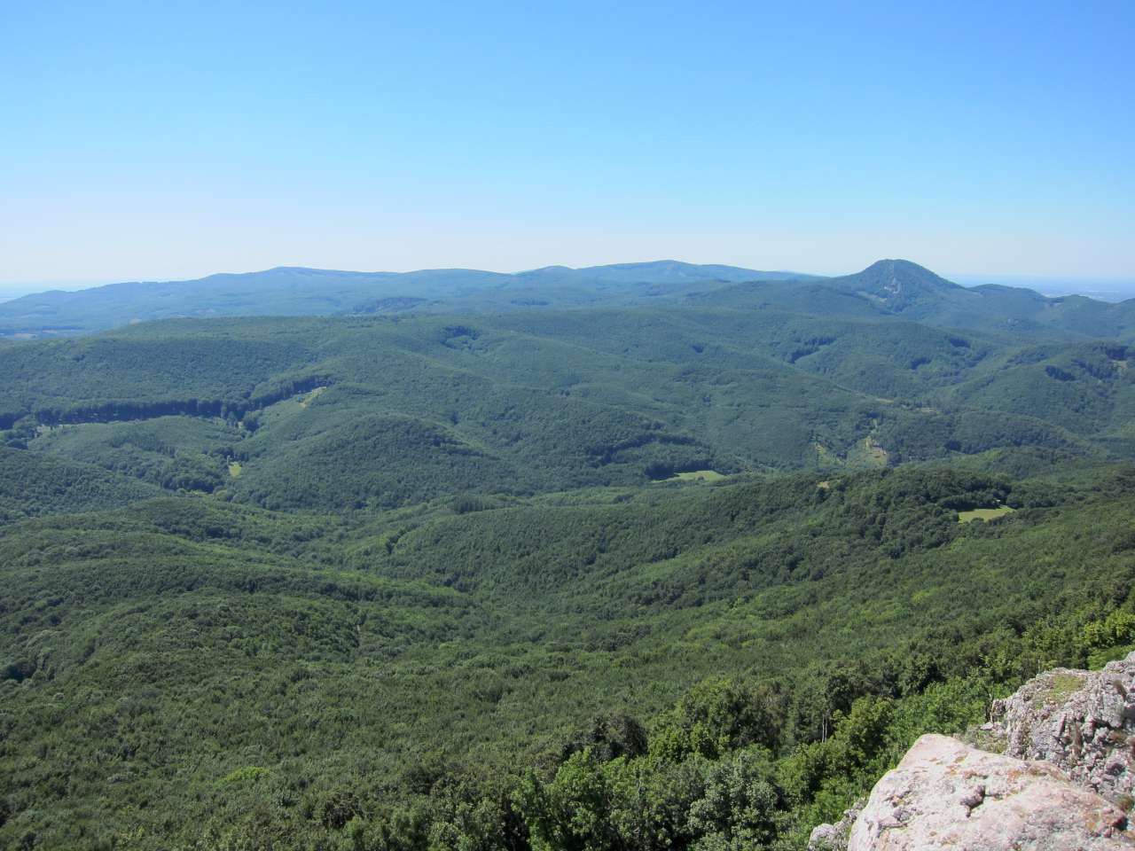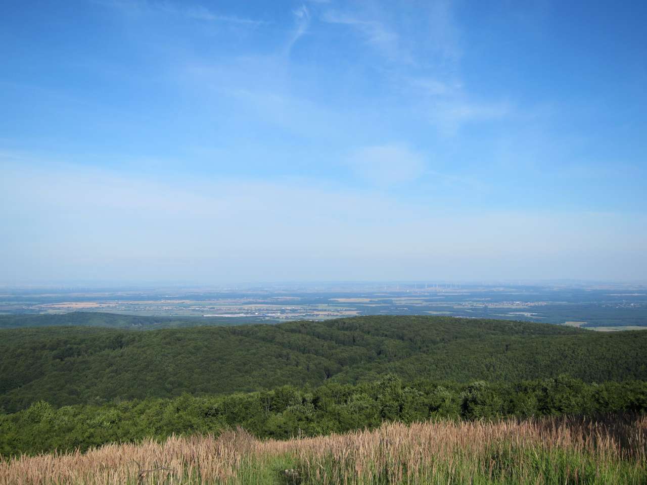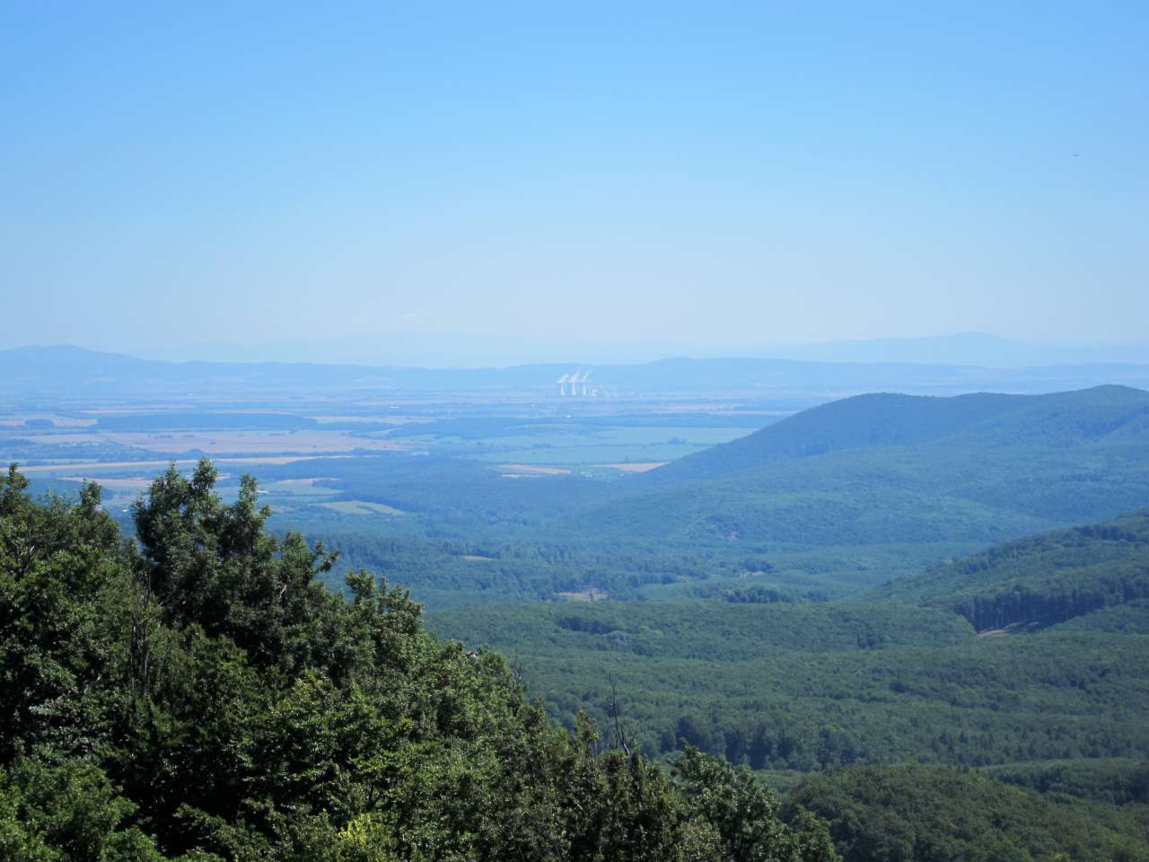 Pokračovali sme na vrch Somár, ktorý sme tiež dovtedy len obchádzali, lebo cykloznačka vedie pomimo. Uvažovali sme, či niekto na Somárovi nespal, keďže na internete ten vrch celkom vychválili. Naozaj, keď sme prišli hore krátko pred ôsmou, boli tam pekné priestory na stanovanie a výhľady boli jedny z najkrajších, aké sme v Malých Karpatoch videli. Nikto hore ale nespal, tak buď ľudia vyrazili skôr ako sme prišli, alebo tam nikto nebol. Na vrcholoch kopcov celkom fúkalo, tak sme boli radi, že sme nakoniec nespali tam - ranný chlad v kombinácii s vetrom by nebol práve najpríjemnejší. Možno tam aspoň nechodí tak veľa zvery ako na Šenkárku :)