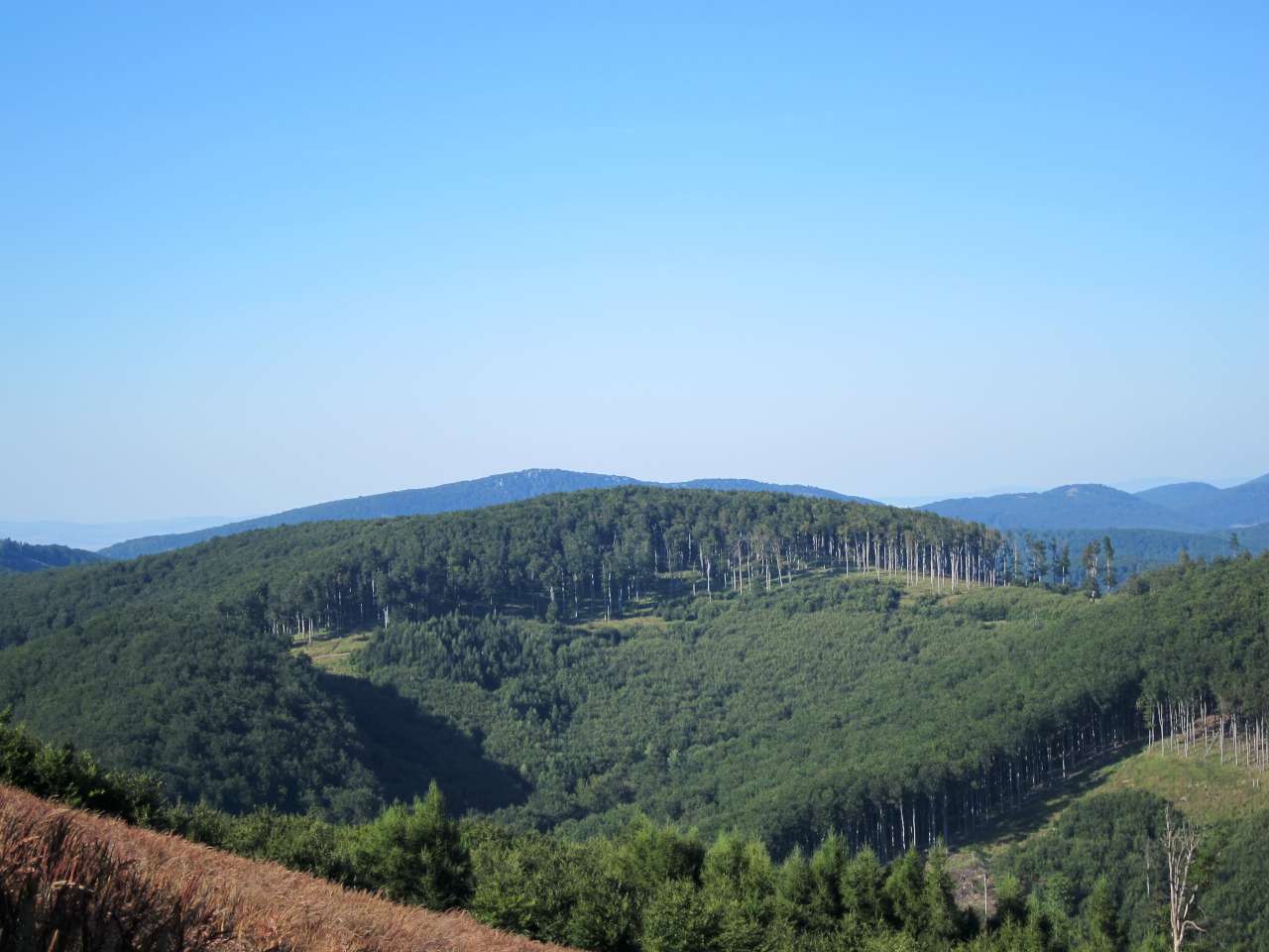 Klesáme do Sološnickej doliny, klesanie bolo dlhé, takže sme stratili takmer všetky nastúpané výškové metre (skoro 500). Z doliny stúpame na Sedlo Skalka a vďaka tomu už dosiahneme úroveň, na ktorej sa budeme pohybovať zvyšok dňa - okolo 500 až 740 m n.m. Sedlo Skalka a blízke okolie sme poznali už cyklovýletu, ktorý sa odohrával pred necelými dvoma týždňami. Nachádza sa tu plot, ktorý ohraničuje zvernicu Biela skala a zdá sa byť nekonečný - celkovo meria okolo 25-30 kilometrov a často ide popri turistických značkách, takže sa môže stať, že má človek tento plot na dohľad aj niekoľko hodín takmer neustále. Zvernica bola vybudovaná v 60. rokoch minulého storočia a pred pár rokmi bola sprístupnená pre verejnosť.